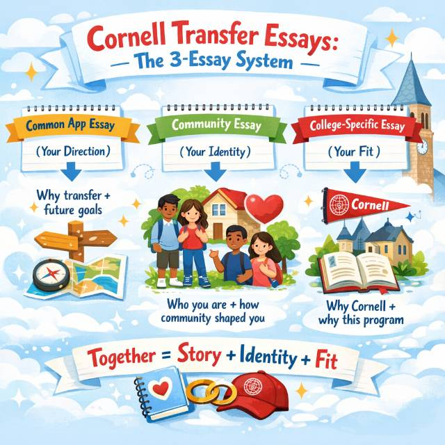Cornell's transfer essays work as a system: the personal statement explains your "why transfer," the community essay reveals your identity, and the college-specific essay shows you belong in that particular program. If you're looking for a deep dive on the Common App piece specifically, the Common App transfer essay guide covers that prompt in full.
