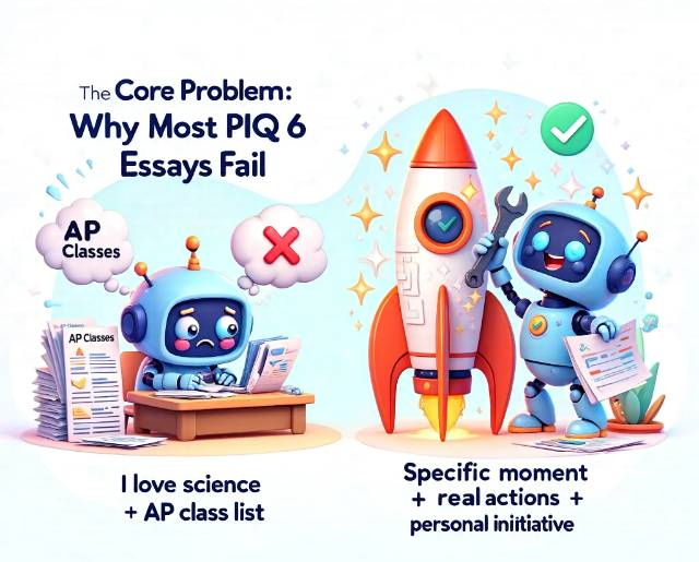 Awards and grades are already in your application. PIQ 6 isn't the place to restate them. Readers want to know what the experience meant to you what you thought about, what surprised you, what you'd keep doing even if no one was watching. - Mistake 3: Letting the essay live entirely inside the classroom.