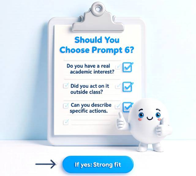 PIQ 6 is a strong pick when you have one clear academic passion you've actually pursued beyond coursework. It's especially effective if you're applying to impacted programs like CS, engineering, or business this prompt is your chance to anchor your application to your intended major in a direct, personal way.